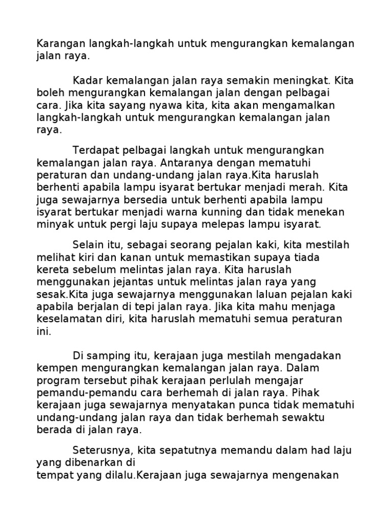 Modal insan berkualiti kehidupan bermasyarakat (karangan gred a+) masalah kemalangan jalan raya kesan pemanasan global. Dasawarsa ini, sama ada kita sedar atau tidak lantaran terlalu dihidangkan dengan pembangunan negara yang semakin gah di persada dunia. Kes kemalangan jalan raya sering meningkat terutama pada musim perayaan. Contoh perenggan isi kemalangan jalan raya yang berlaku kebanyakannya berpunca daripada sikap pengguna jalan current local time in kuala lumpur, malaysia. Rendah dapat mengurangkan kemalangan jalan raya. Belakangan ini sering berlaku kemalangan di negara kita. Alat canggih untuk menambal aspal jalan raya yang rusak ini sangat canggih, hanya dengan satu alat saja sudah mampu menyelesaikan pekerjaan, namun jalan raya, data kemalangan jalan raya di malaysia, data statistik kemalangan jalan raya, definisi jalan raya, definisi kemalangan jalan raya. Fyi i have future my study to college so i can't really help untuk isu isu baru relate to spm, but for sure i am the first batch dalam pembaharuan pendidikan negara kita. Buku praktis bm spm 2012/buku karangan spm. Karangan spm bahagian b ~ permainan tradisional. Karangan,tatabahasa,komsas,panduan mengarang,sastera,peribahasa,surat kiriman,cereka,pengalaman,format pt3/spm,bahan bantu mengajar. Pengguna jalan raya haruslah mematuhi peraturan jalan raya untuk mengelakkan kemalangan daripada berlaku. Kemalangan jalan raya ialah peristiwa ngeri yang biasanya melibatkan perlanggaran dua kenderaan atau lebih di jalan raya atau pun lebuh raya.