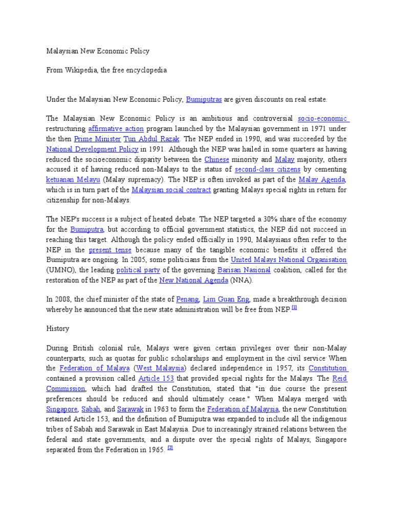 The new economic policy (nep) which compel between the years 1971 until 1990 had became a talking point even after 20 years its implementation. The new economic policy (nep) (malay: The nep contained both a broad development identification of race with economic function (malaysia 1973). The policies covered in this study include the: Since the 1970s malaysia achieved a remarkable transition towards a broad based economy that benefitted from favourable demographic conditions.